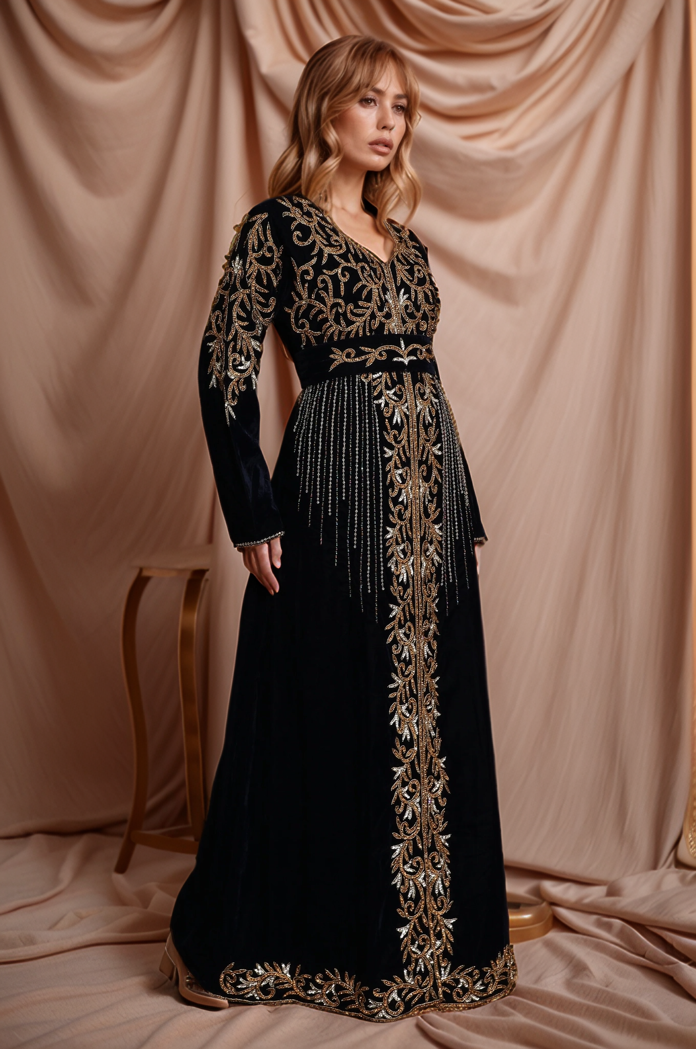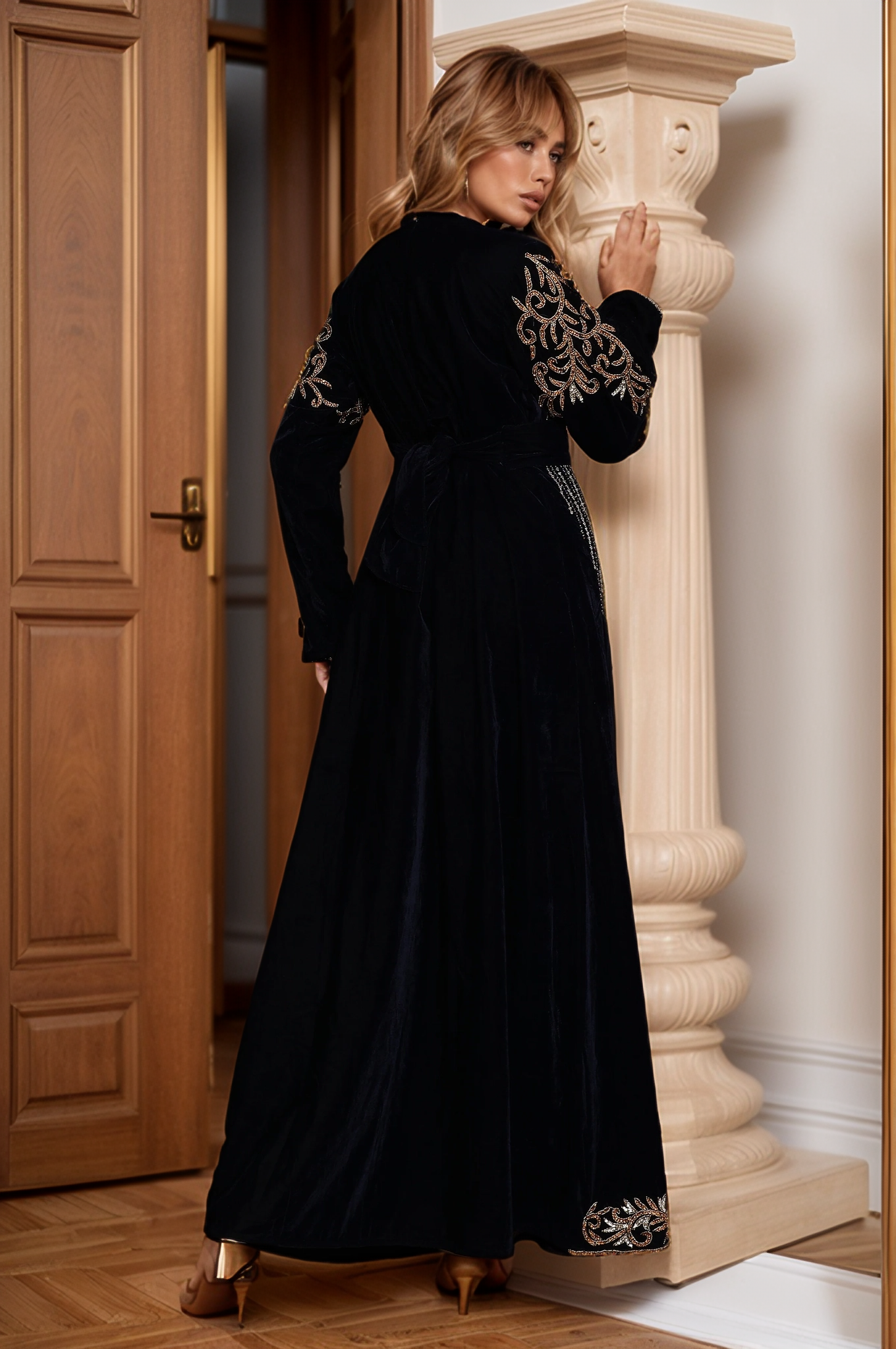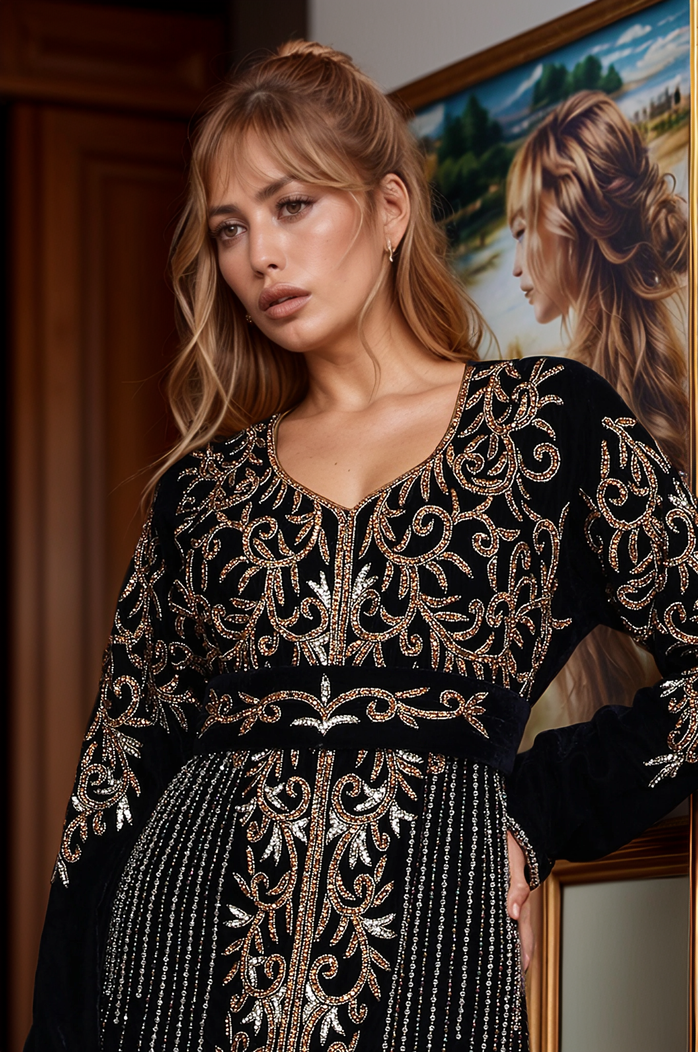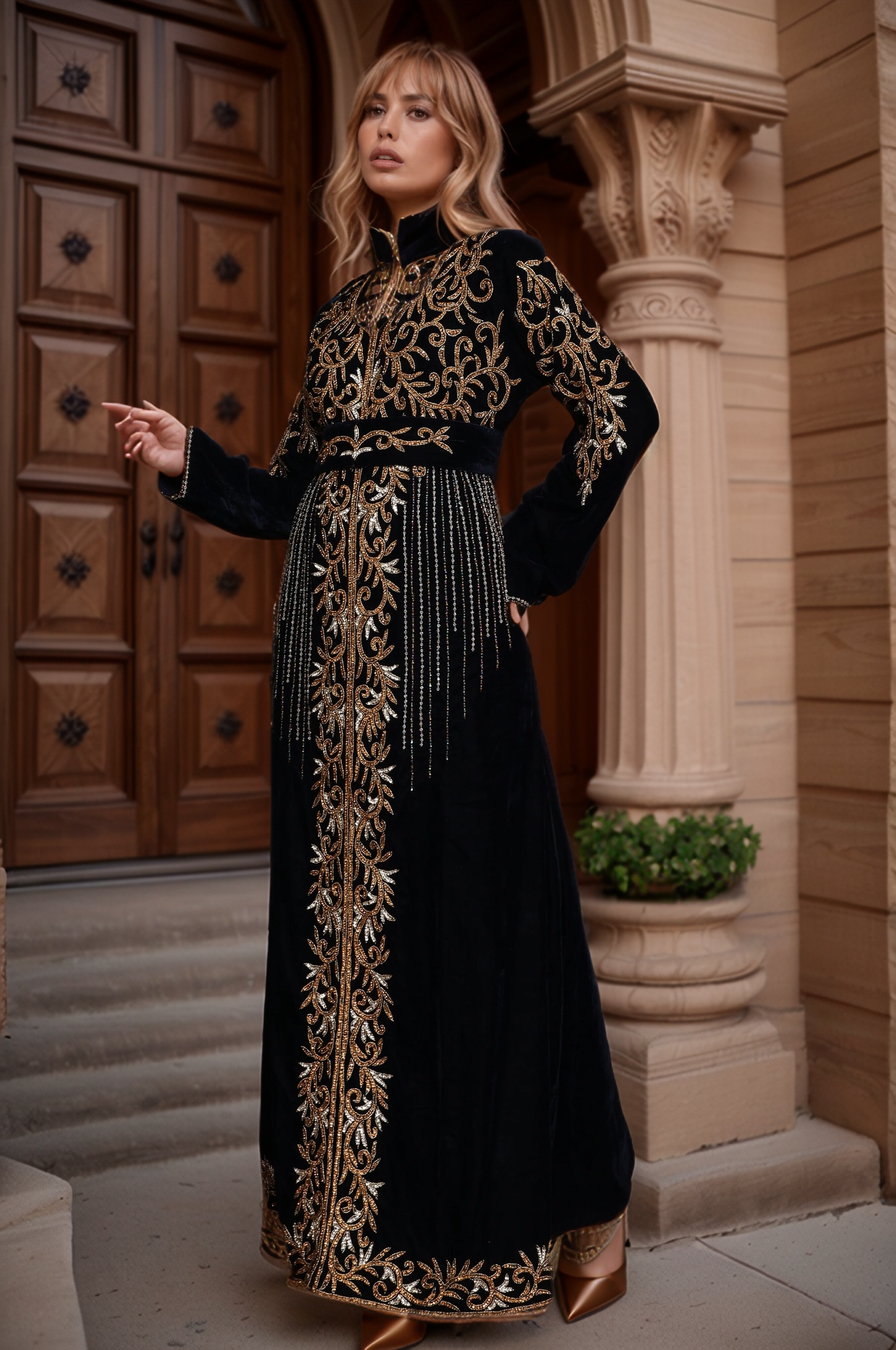 Step into a world of timeless elegance with the Majestic Black Velvet Kaftan with Golden