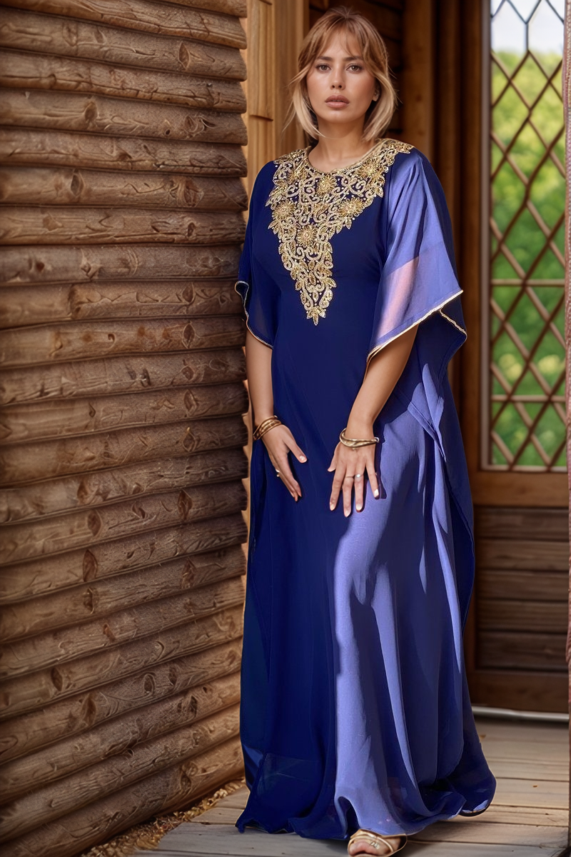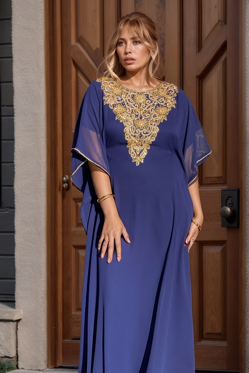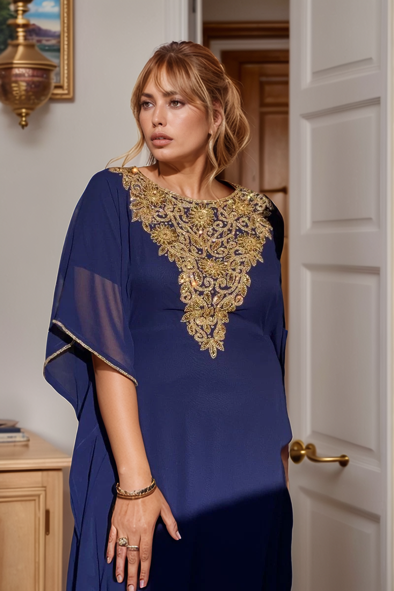 Step into a world of timeless elegance with our exquisiteStunning Navy Blue Kaftan with Intricate Gold Sequin Embellishments. Crafted from a luxurious, lightweight chiffon fabric, this kaftan dress drapes beautifully, offering a comfortable and flattering fit for all body types.