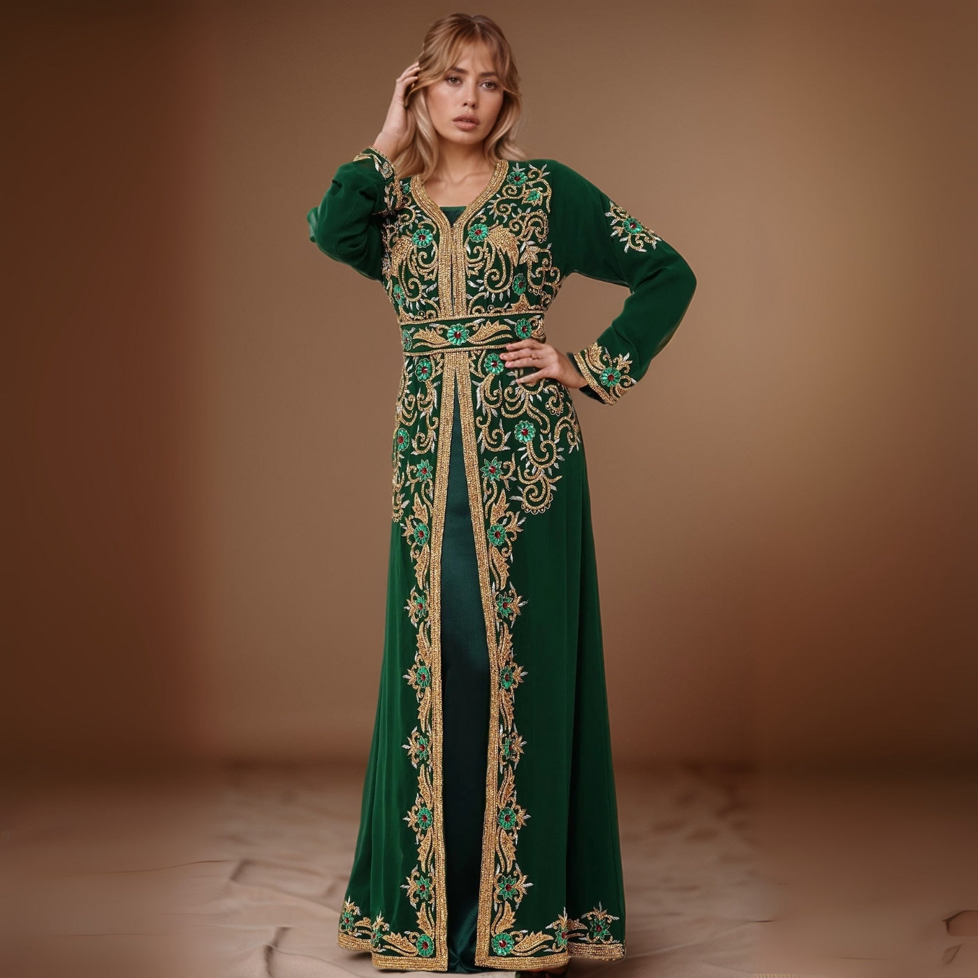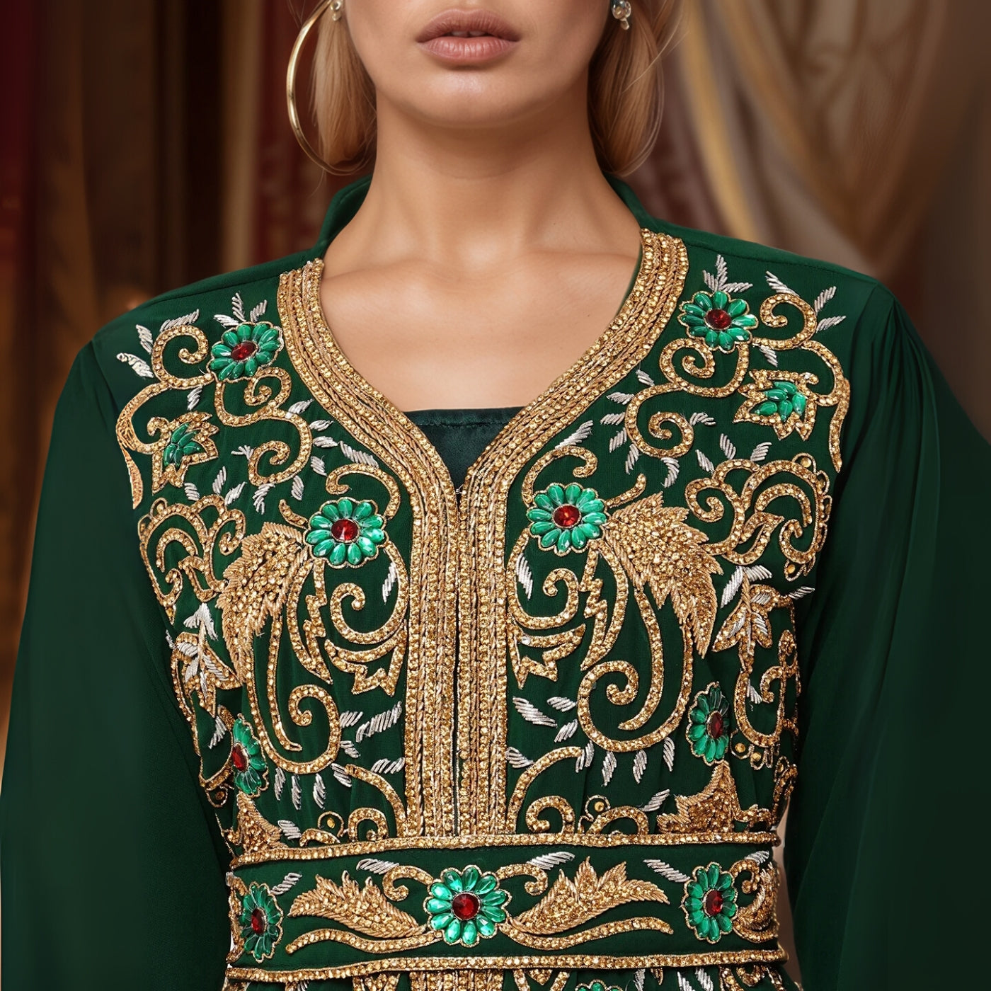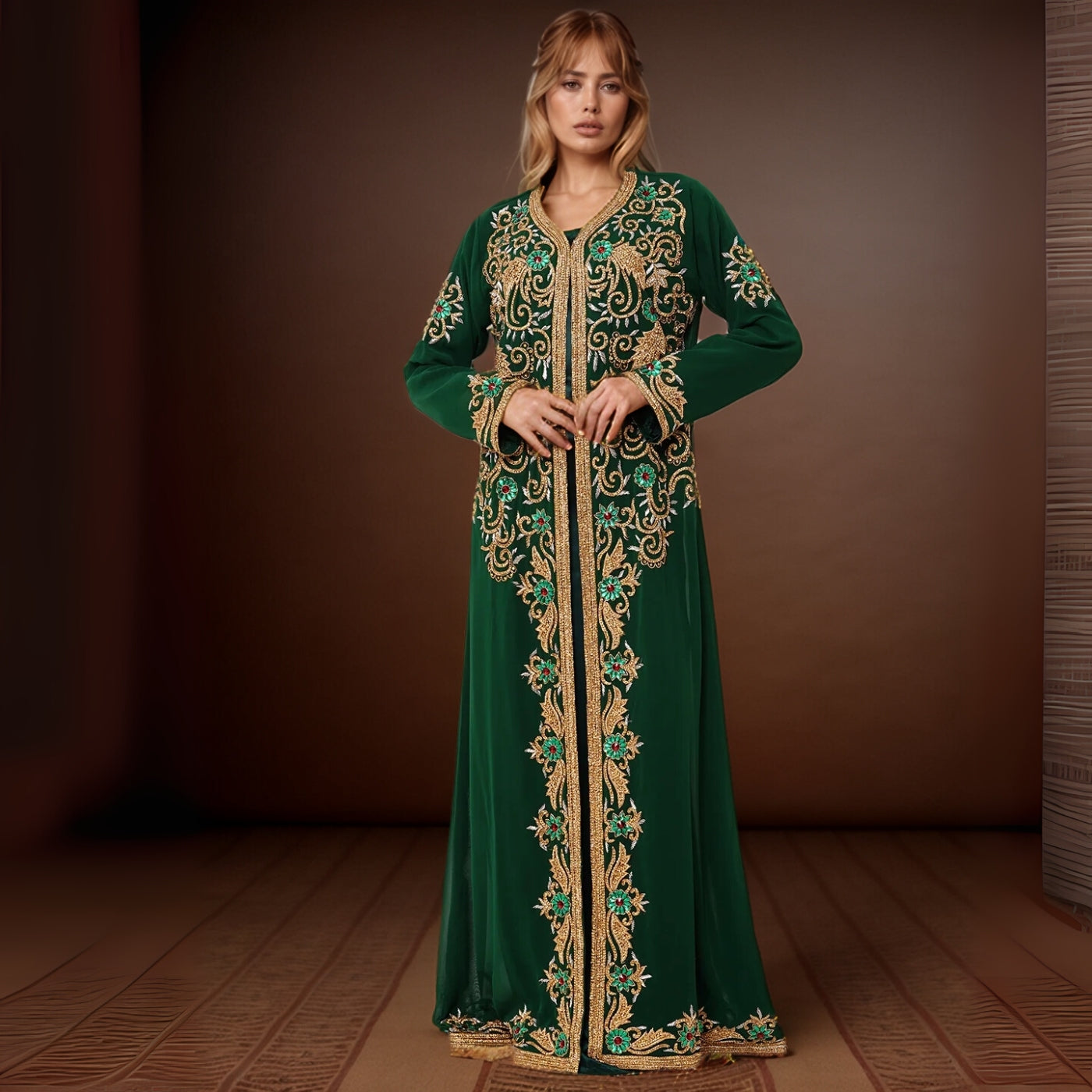 blends tradition with modern flair. This breathtaking emerald green kaftan, crafted from