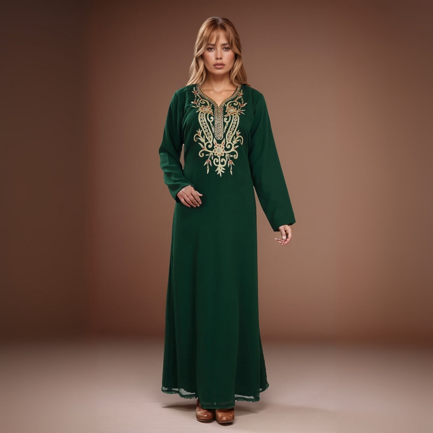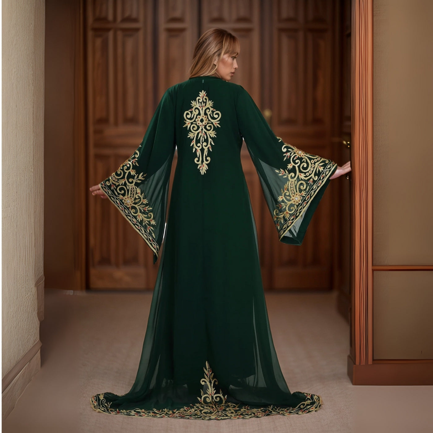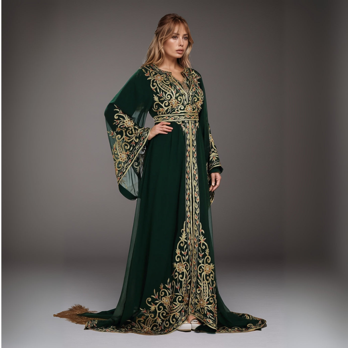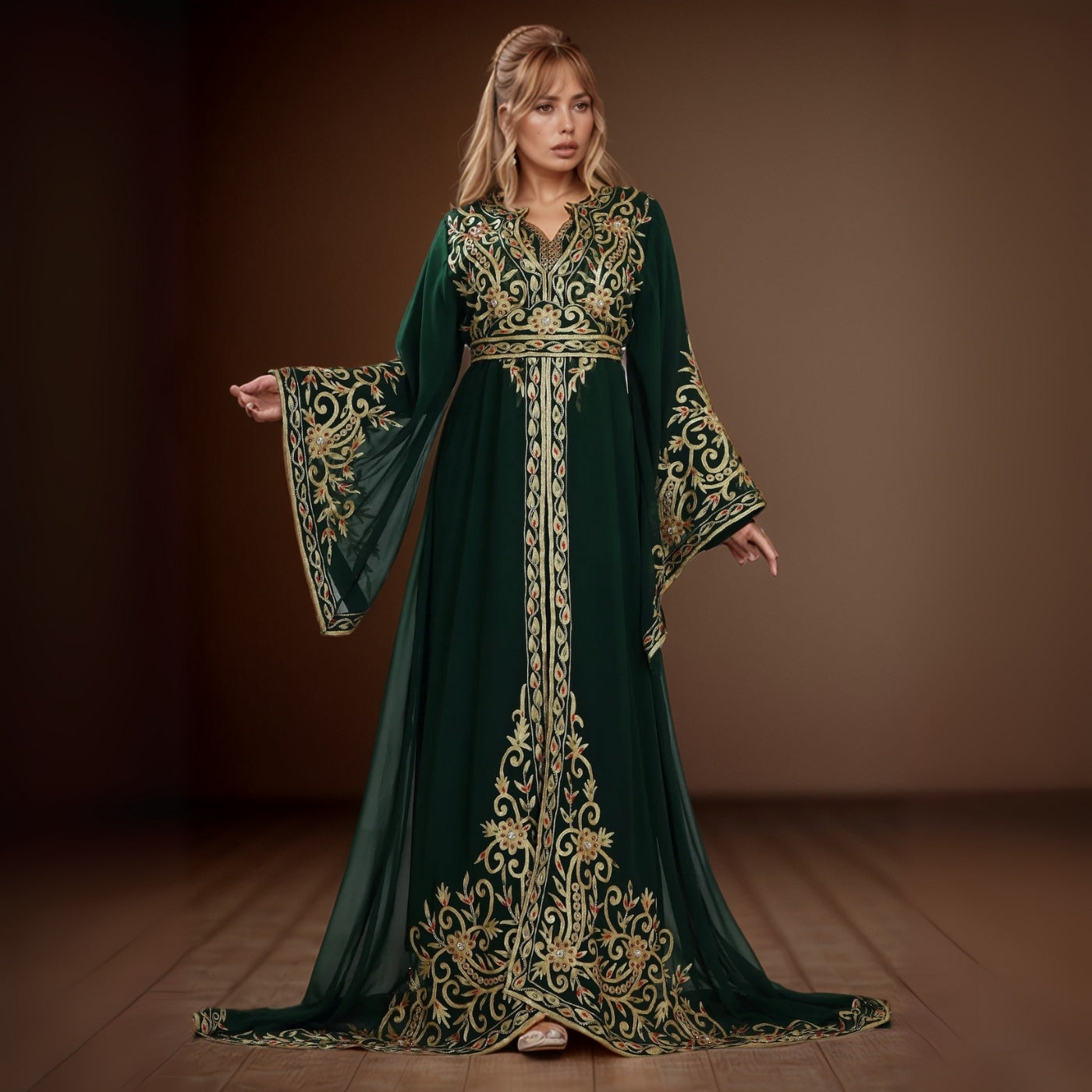 Dive into opulence with the Emerald Moroccan Kaftan Gown, a stunning masterpiece also