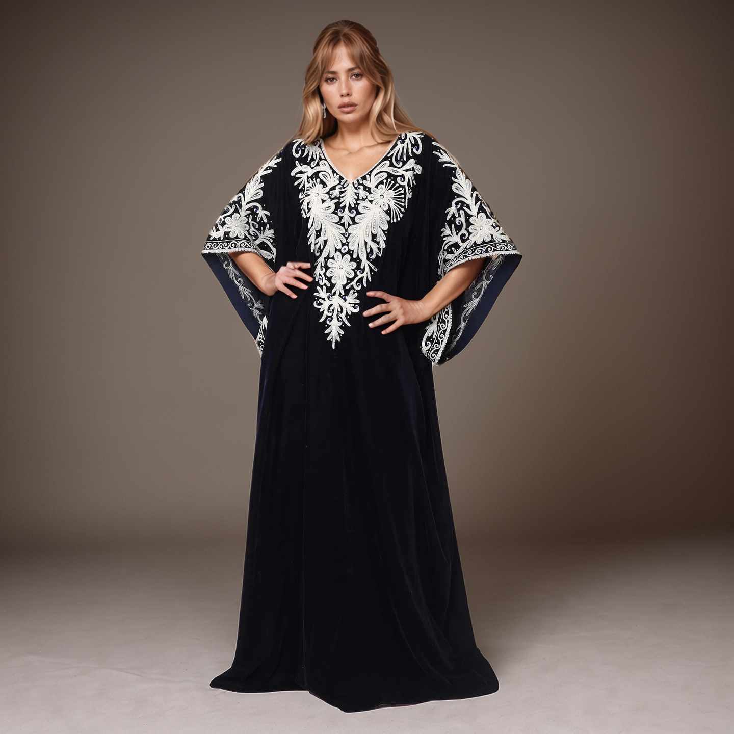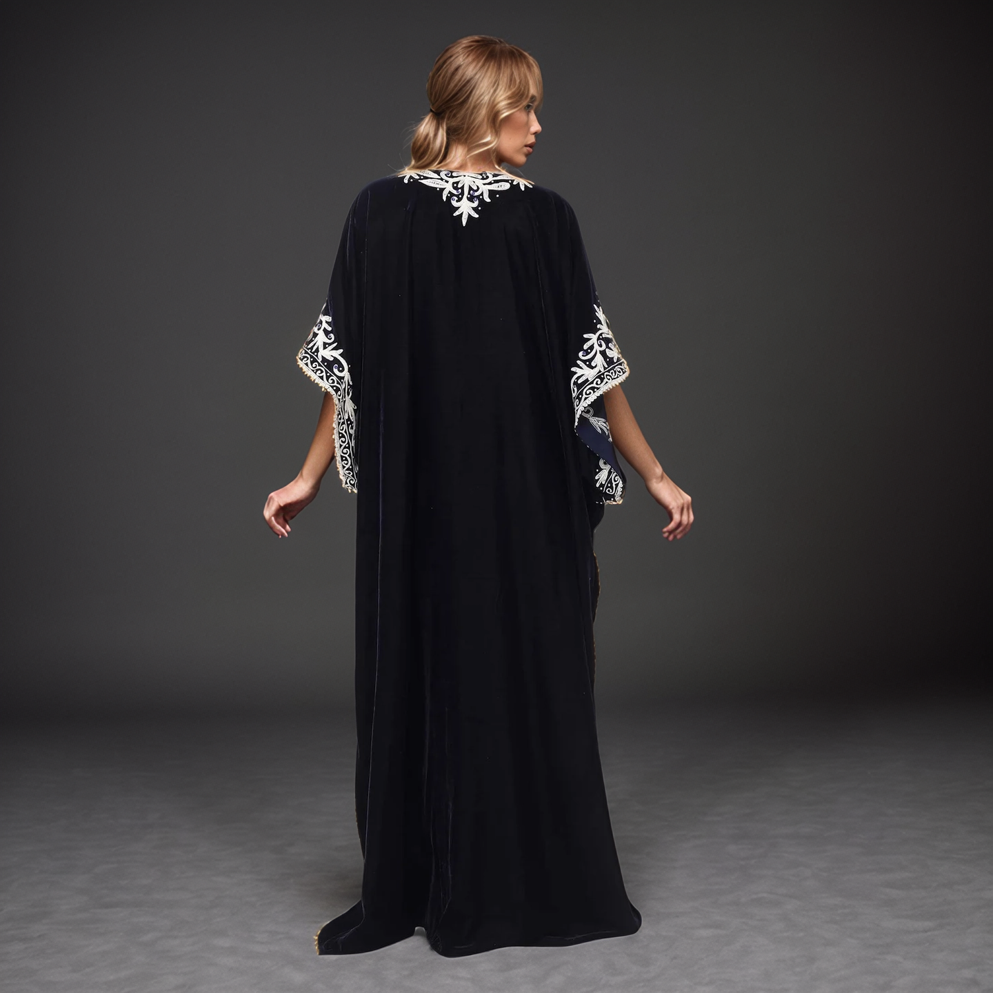 Majestic Black Velvet Kaftan with Embroidered Elegance