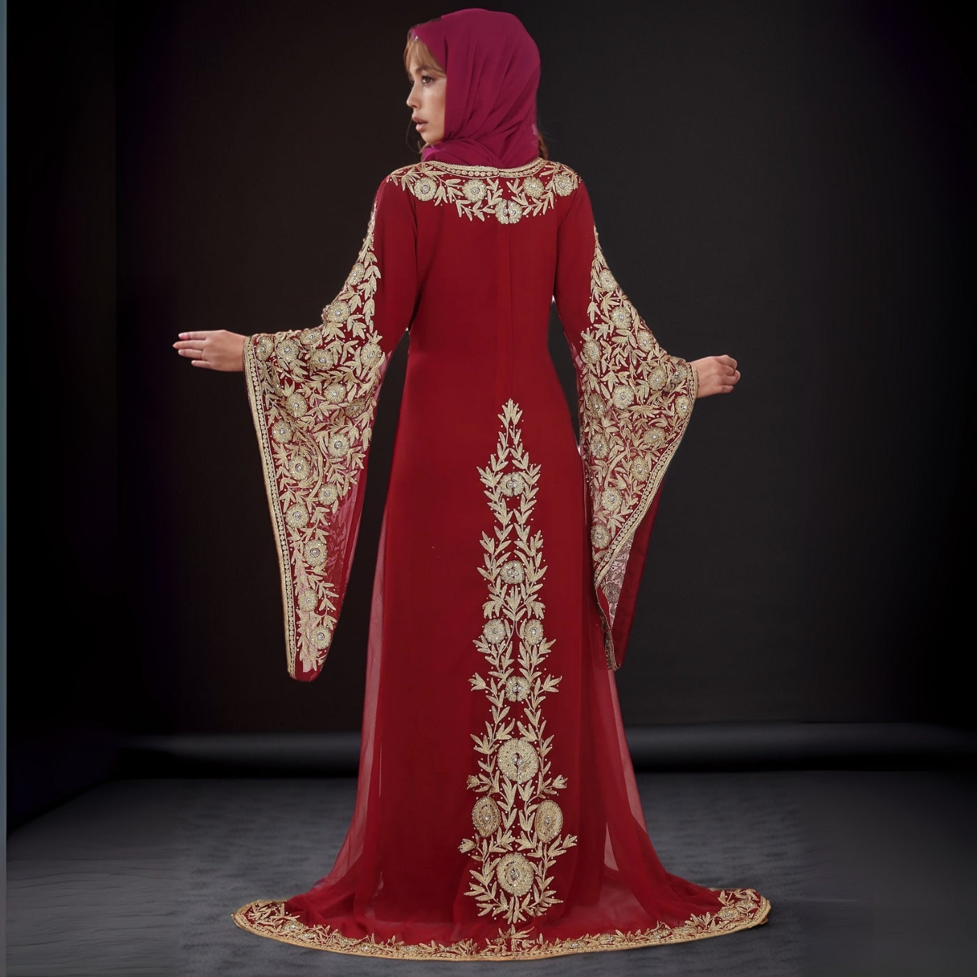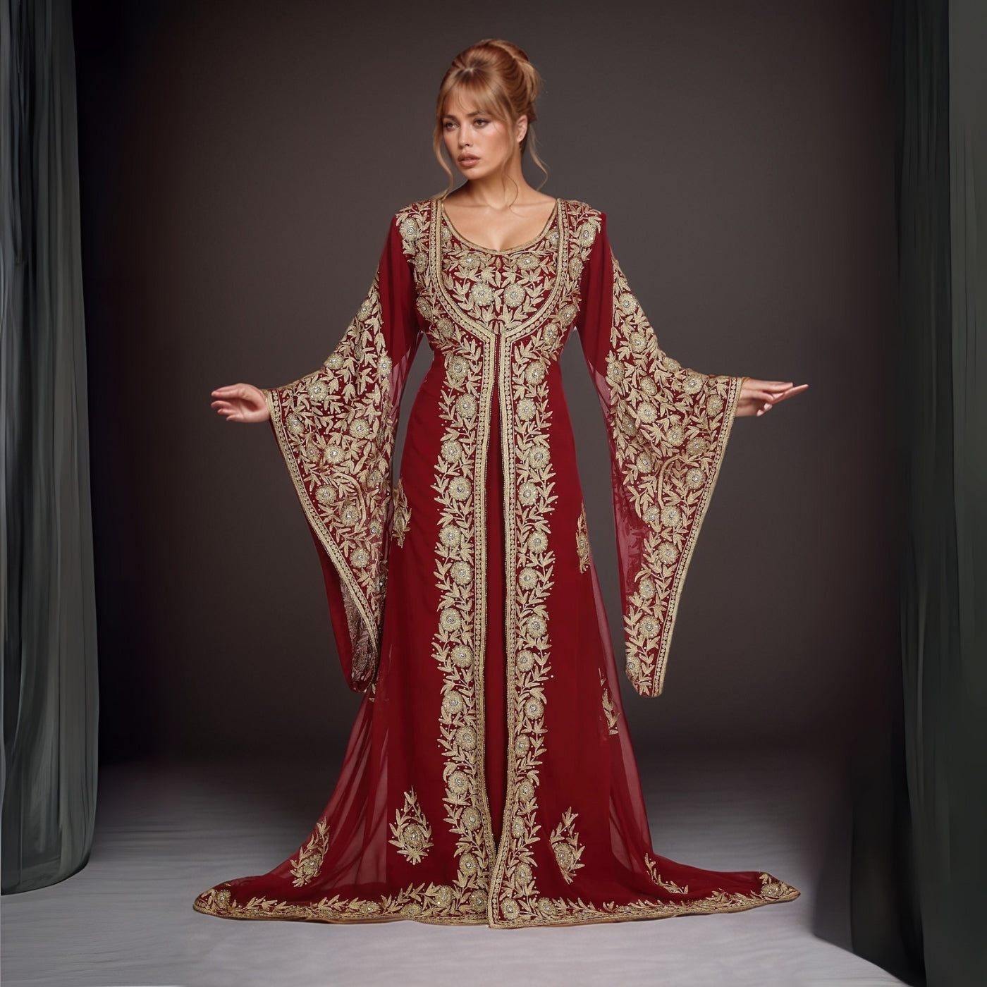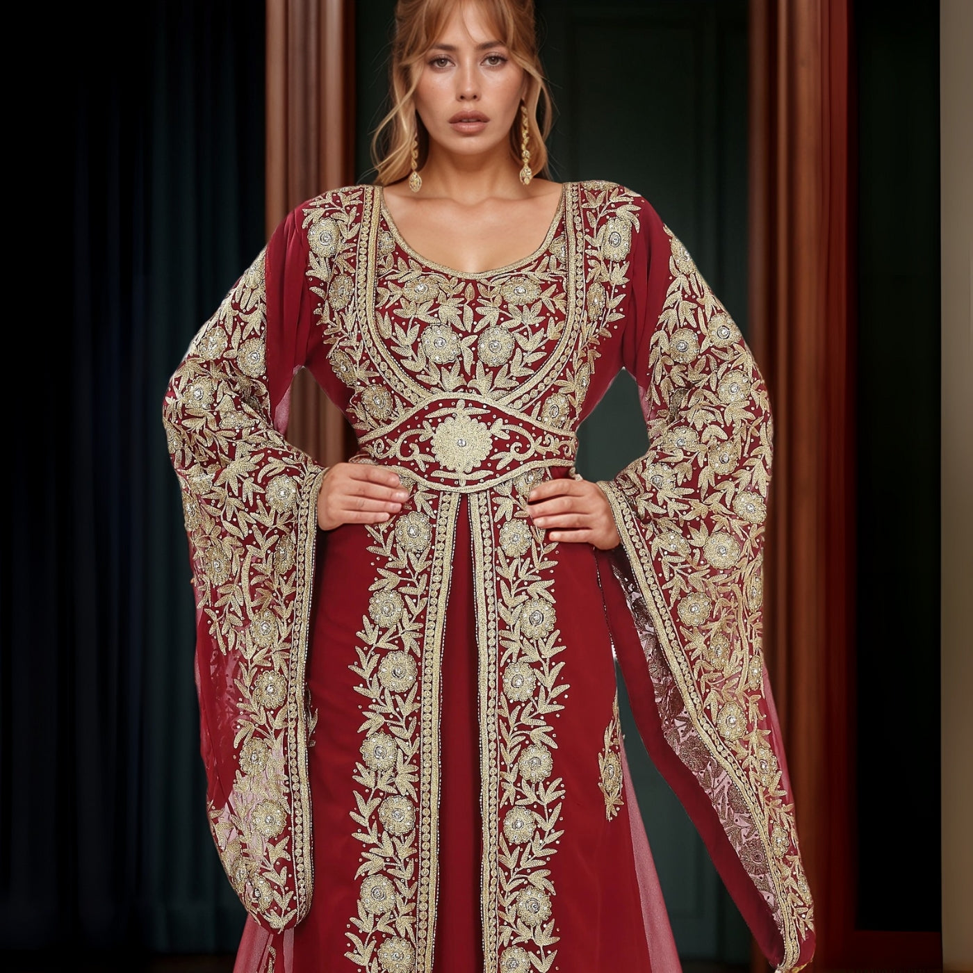 Step into timeless elegance with the Maroon Moroccan Kaftan Gown, a stunning blend of