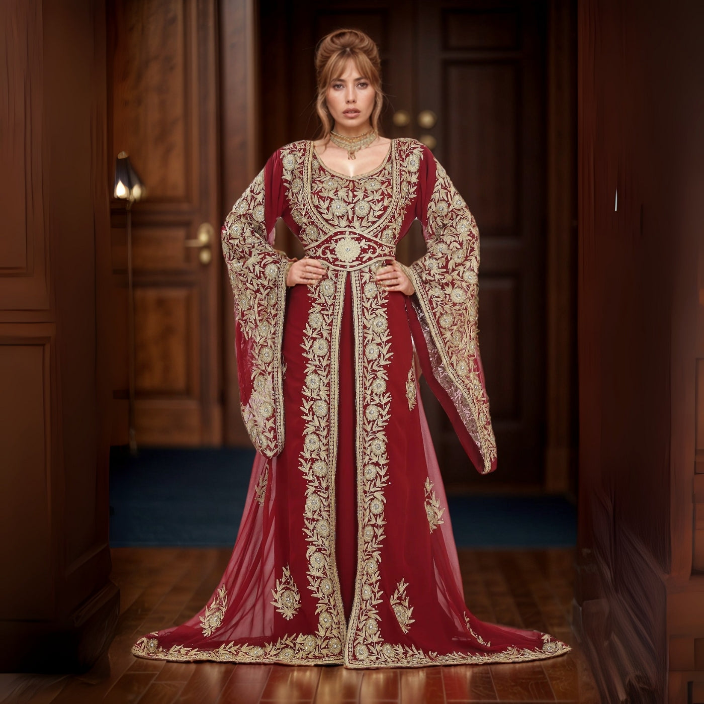 tradition and luxury, also known as a takchita or jellabiya. This rich maroon masterpiece is