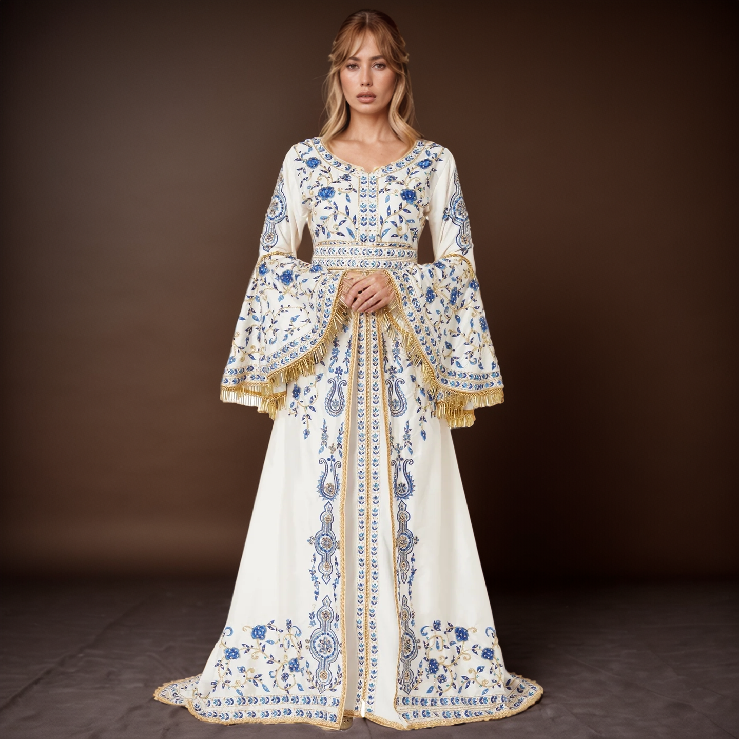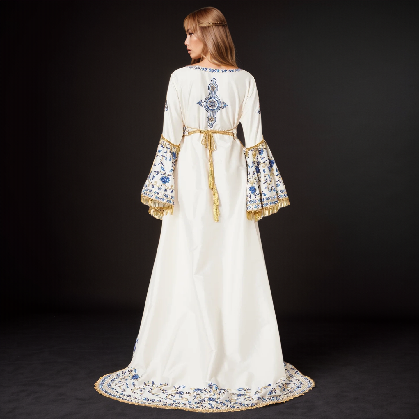 hand-embroidered with intricate blue floral motifs and shimmering gold accents, transforms any occasion into a regal affair. Crafted from luxurious white fabric, its flowing bell sleeves and tassel-detailed belt exude timeless grace. Perfect for weddings, cultural festivals like Eid, or glamorous galas, this dress blends heritage with haute couture, making you the epitome of elegance. As a special compliment to our buyers, a matching scarf is included free with every dress—enhance your style effortlessly! Step into history and shine with every step!