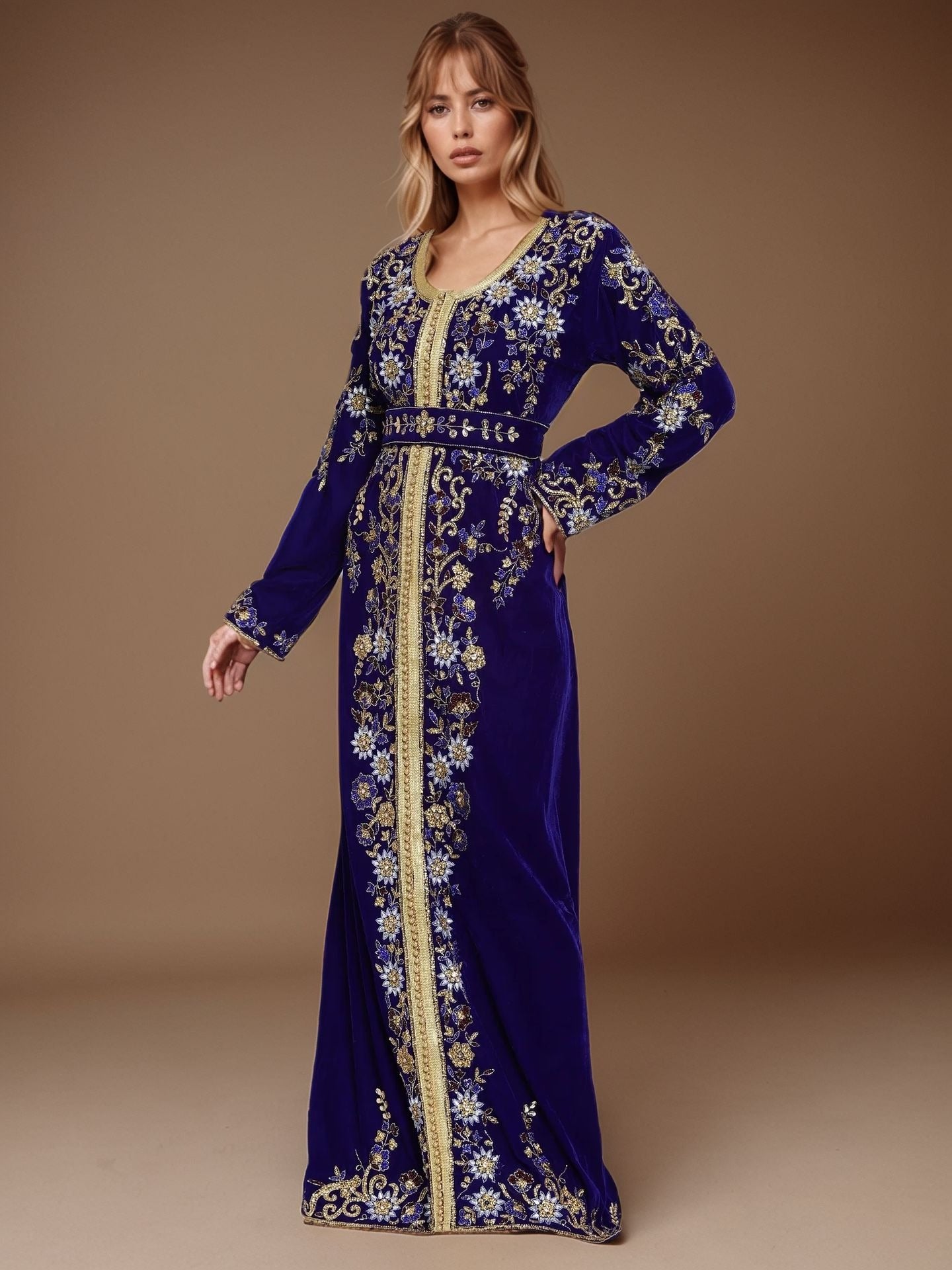 Moroccan heritage. The long, flowing silhouette, cinched with a delicate belt, creates a